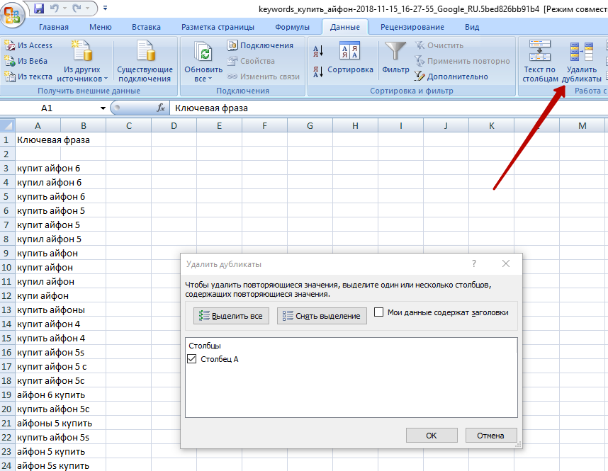 Для начала вам нужно сгруппировать запросы, выделить отдельные кластеры, под которые будет продвигаться каждая отдельная страница. Перед этим удалите дубли, то есть повторяющиеся ключевые слова. Выделите столбец, зайдите в «Данные — Удалить дубликаты»: