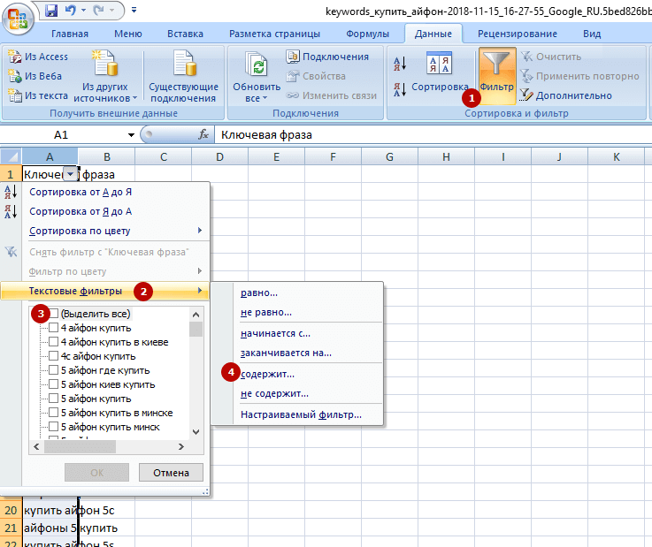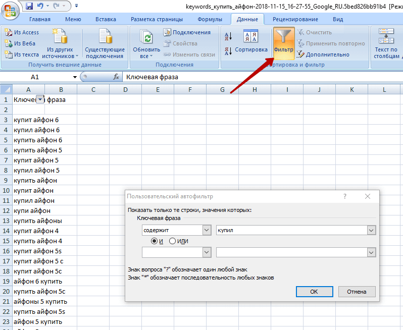 Затем чистим ключевые слова. Например, в списке вы видите ключи, содержащие слово [купил]. Скорее всего, по такому ключу ищут отзывы покупателей. Их нужно убрать. Для этого выделим их в отдельную группу. Зайдите Данные — Фильтр. Уберите галочку напротив «Выделить все». Затем выбираем «Содержит».
