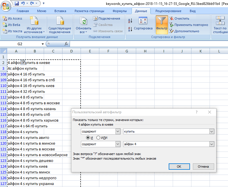 Когда вычистили мусор, займитесь группировкой. Допустим, у нас на сайте будет отдельный каталог iPhone 4. Нам нужны ключи со словом [купить], и содержащие слова [айфон 4].