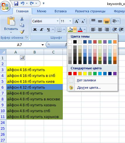 Мы получаем список ключевых слов, которые можно между собой уже сгруппировать по смыслу, и под которые в будущем сделаем отдельные карточки товаров. Выделяем их разными цветами: