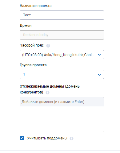 Задайте нужные параметры. Укажите свой часовой пояс, конкурентов, какой домен отслеживать — корневой или поддомены.