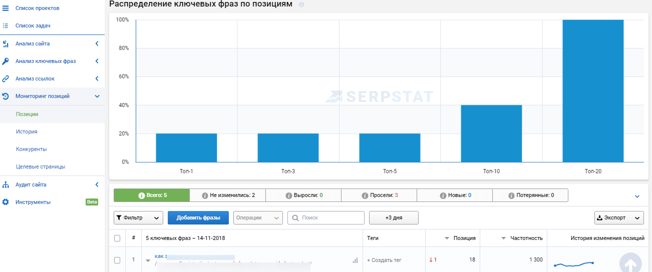 На графике вы сразу увидите, какой процент фраз входит в топ-1, топ-5 и так далее. Ниже видно, позиции по каким фразам не менялись, выросли или просели.