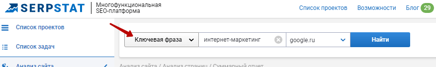 Чтобы собрать поисковые запросы, выберите в поисковой строке сервиса параметр «Ключевая фраза» и напишите ключевое слово.