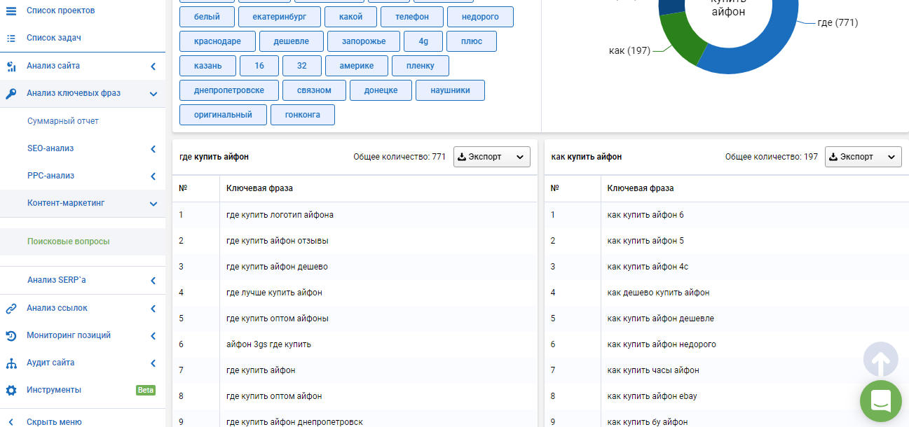 В отчете вы увидите самые популярные фразы в облаке и на диаграмме. Ниже находится таблица с поисковыми вопросами, разделенная на разные группы запросов по словам: где, как, что, какой, сколько и т.п. Такая разбивка поможет составить тщательный контент-план, исходя из разных типов запросов.