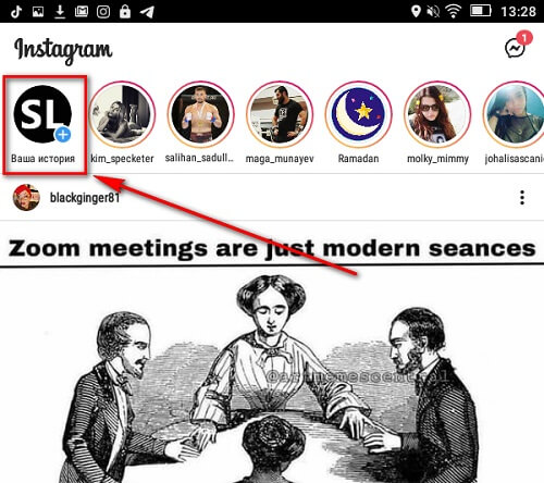 Открываем редактор сторис любым удобным способом (например, жмем на свою аватарку в кружке, где размещаются новые сторис или открываем инструмент историй через + на главной странице профиля).