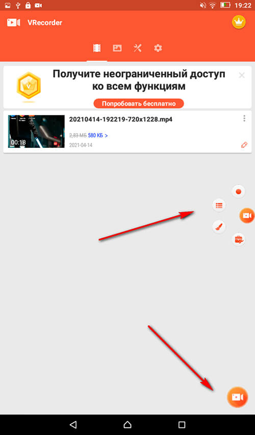 Сразу после выбора разрешения, приложение начинает запись экрана. Чтобы остановить запись, жмем на кружок с таймером. На значке камеры сбоку можно нажать на паузу и снова запустить запись. Если же нажать на нижнюю камеру, запись просто остановится. Видео автоматически сохраняются в галерее приложения и в отдельной папке на телефоне.