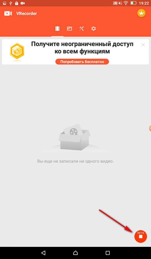 - Жмем на серый значок записи, затем «Начать запись». Чтобы остановить запись — жмем еще раз на значок записи или на строку с таймером в верхней части экрана.