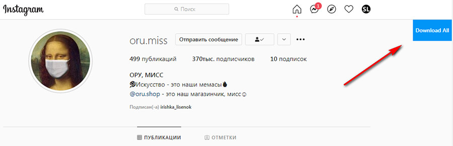 Устанавливаем расширение и можно сразу заходить на нужный аккаунт в Инстаграм (с которого хотим скачать сторис). Есть кнопка «Download all», которая позволяет скачать весь контент аккаунта.