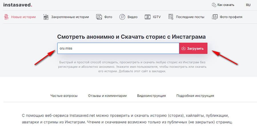 Рассмотрим на примере instasaved.net. Заходим на сайт, в строке поиска пишем логин без собачки и жмем кнопку «Загрузить».