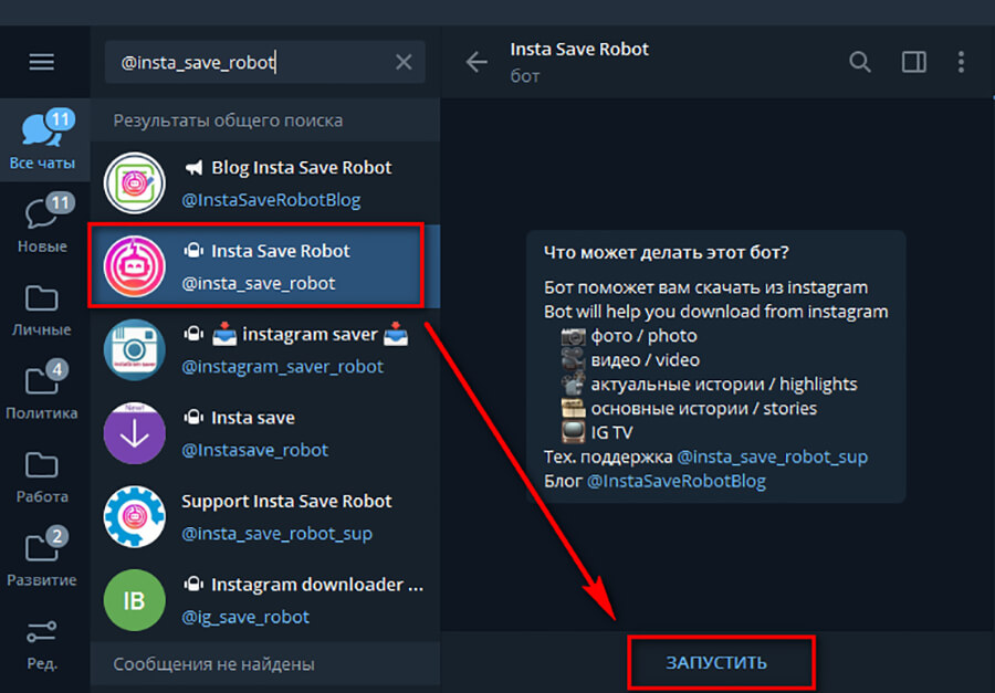 С задачей справятся боты @insta_save_robot, @InstaBot и @SaveZBot — первый позволяет скачивать обычные сторис, хайлайты и фотографии, два других кроме сторис скачивают прямые эфиры и IGTV. Рассмотрим на примере @insta_save_robot: