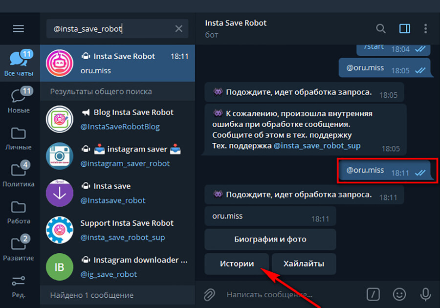 Появляется меню. Нажимаем на кнопку «Истории». Бот присылает все найденные истории.