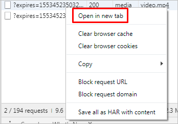 После этого включаем проигрыватель в левой части окна. Когда в нижней таблице появится адрес файла с форматом “video.mp4”, нажмите на него правой кнопкой мыши и откройте в новой вкладке.