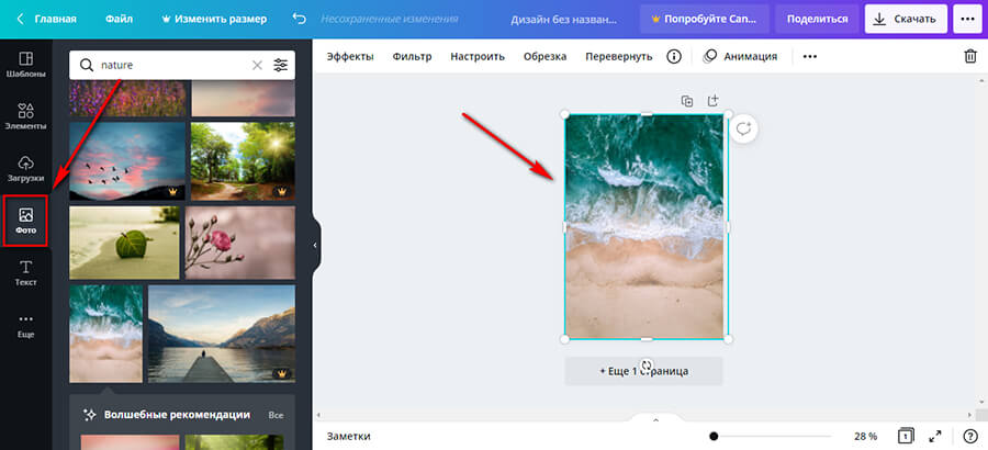 Например, хотим сделать чек-лист для путешествий. Добавим фото природы в качестве фона — раздел «Фото», ключевик «nature».