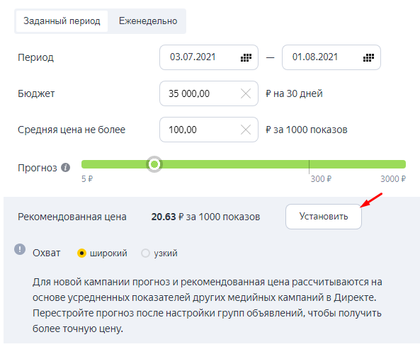 На основании выбранной стратегии, цели показов, бюджета и сроков проведения кампании система рекомендует установить определенную цену.
