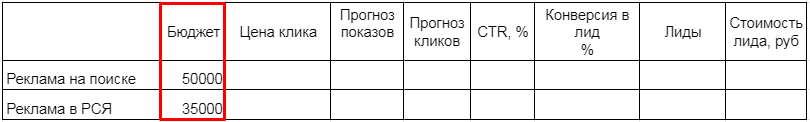 Внесем в медиаплан размер бюджета на рекламу на поиске и в РСЯ.