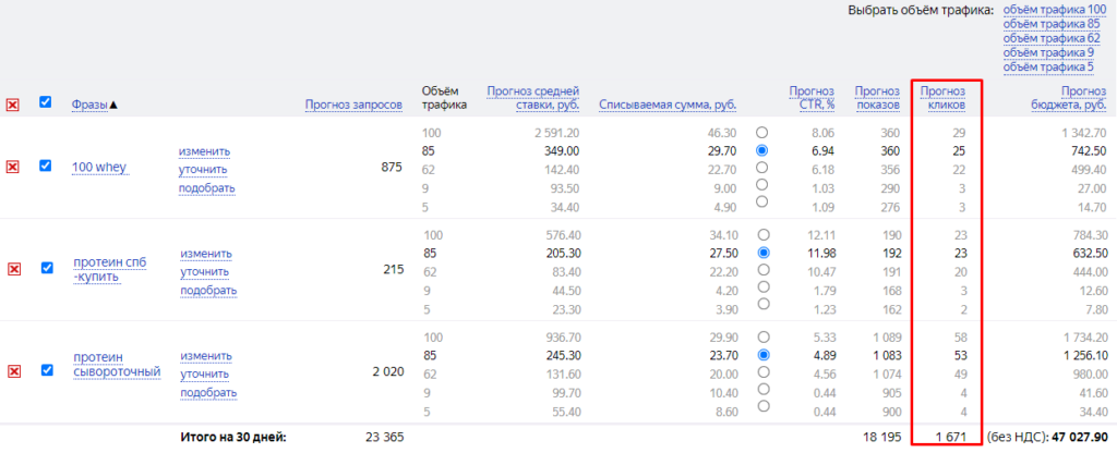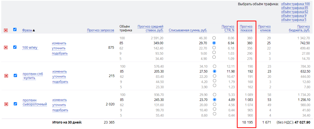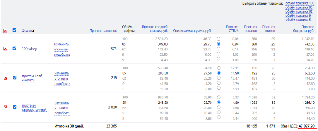Установим по всем словам объем трафика 85%. В этом случае прогнозируемый бюджет на кампанию составит 47 027,90 рублей.
