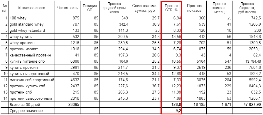 CTR. Средний CTR для кампаний на поиске составляет 5–15%. Но для получения более точных результатов рассчитаем этот показатель с помощью таблицы с прогнозами. Для этого вычисляем среднее CTR по всем ключевым словам: складываем значения CTR по каждому ключевику и делим на их количество.