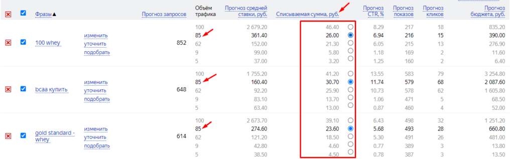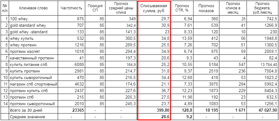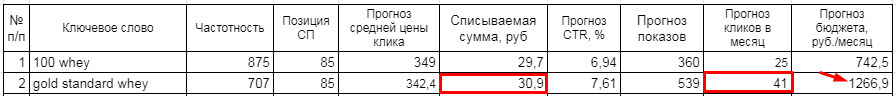 Для расчета бюджета по каждому ключевому слову система учитывает показатель «Списываемая сумма» и умножает его на количество кликов. Например, прогнозируемый бюджет на показ рекламы по запросу «Gold standart whey» составит 30,9*41=1266,9 рублей.