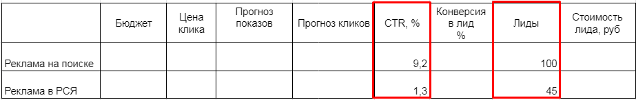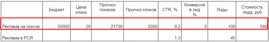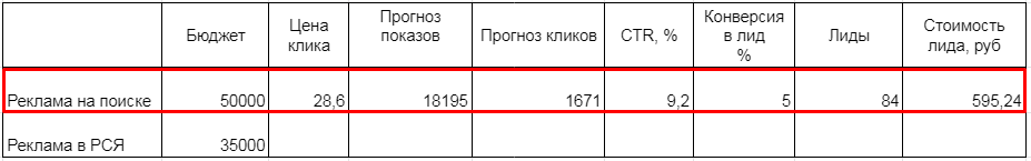 Для заполнения остальных столбцов следует проводить отдельные расчеты для кампании на поиске. Для этого воспользуемся данными из прогнозатора и заполним пустые строки в таблице.