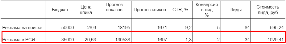 Лиды. Для прогноза лидов умножаем количество показов на CTR и на показатель конверсии в лид: 130538*0,013*0,02=34 лида.