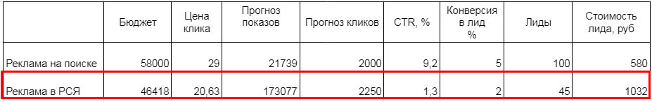Лиды. Для расчета полученных от рекламной кампании лидов умножаем количество прогнозируемых показов рекламы на CTR и на показатель конверсии: 18195*0,05*0,092=84 лида.