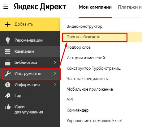 В Яндекс.Директе есть свой инструмент для прогноза бюджета. В главном правом меню выбираем «Инструменты» – «Прогноз бюджета».