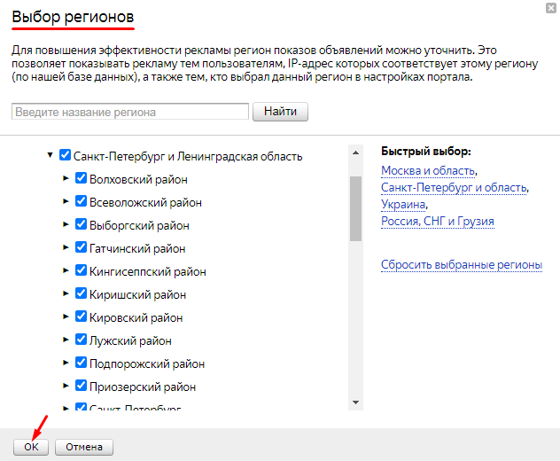 1. Указываем таргетинг по местоположению. В нашем примере – Санкт-Петербург и область;