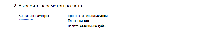 2. Выбираем параметры расчета. Здесь указывается, за какой период нужен прогноз, на каких площадках будет показываться реклама, валюта.