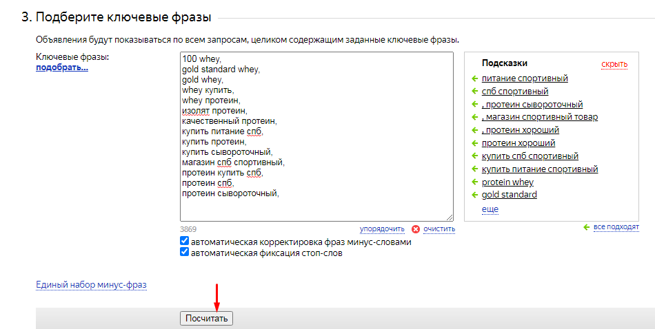 3. Указываем ключевые слова, по каким хотим показывать рекламу. Система автоматически подбирает подсказки, корректирует фразы минус-словами и фиксирует стоп-слова.
