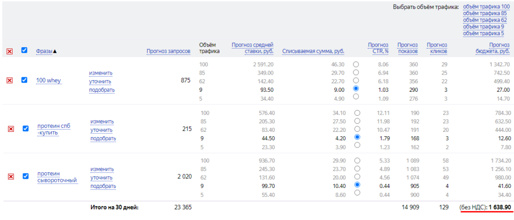 Из таблицы ниже мы видим, что прогнозный бюджет составит 1638,90 рублей. Но в этом случае алгоритм будет работать так, чтобы ориентировочно по рекламной кампании получить объем трафика 9%.
