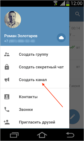 На телефоне (Android или iPhone) открыть меню и нажать “Создать канал”.
