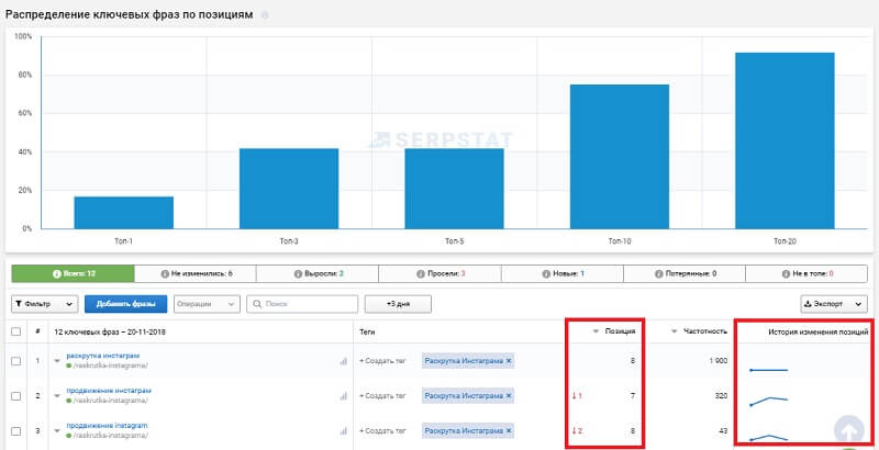 Мы поставили на отслеживание 12 ключевых фраз в двух поисковых системах. И выбрали период обновления, каждый день. В результате мы видим распределение ключевых фраз по позициям в Яндексе и Google, историю изменения позиций в виде графиков, а также текущую позицию и изменение относительно прошлой проверки.