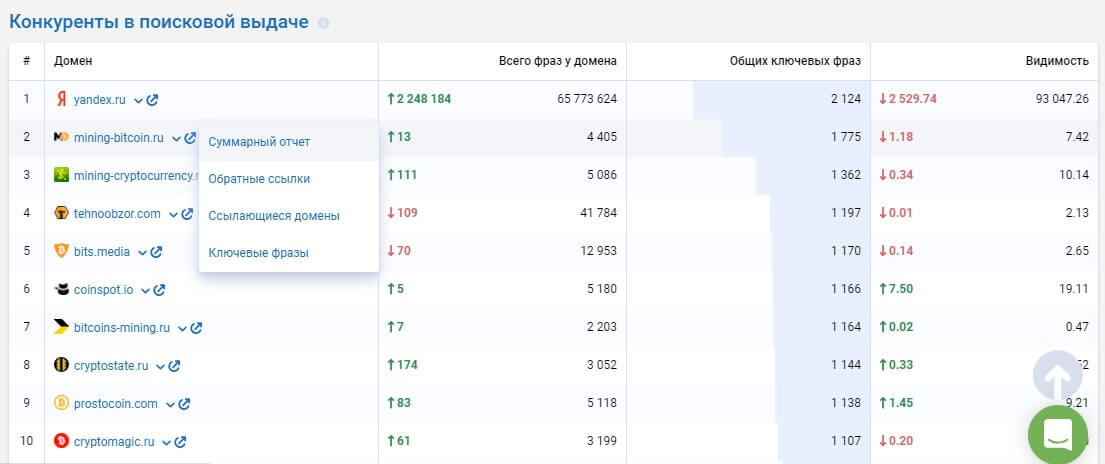 Прокрутите ниже, чтобы увидеть сайты, с которыми вам придётся конкурировать за место в ТОПе по нужному запросу. Если рядом с сайтом, нажать стрелочку вниз, можно выбрать более подробный отчёт по нему.