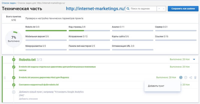 После того как сайт сделан, чекаем его на корректность технической части, так как только “технически здоровый” сайт будет расти в поиске. Для этого воспользуемся чек-листом в личном кабинете Serpstat. Переходим «Список задач — Добавить список задач». В открывшемся окне выбираем шаблон «Техническая часть».