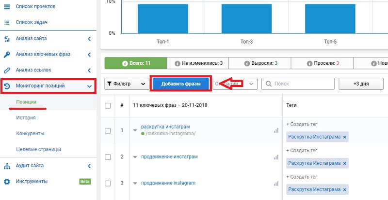 При необходимости можно предоставить гостевой доступ для заказчика. Ключевые фразы мы добавим отдельно. Для этого переходим по цепочке «Мониторинг позиций — Позиции — Добавить фразы».