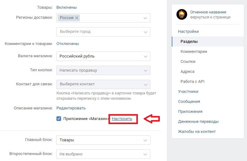Настройка интернет-магазина ВКонтактеПосле этого появятся новые пункты настроек.