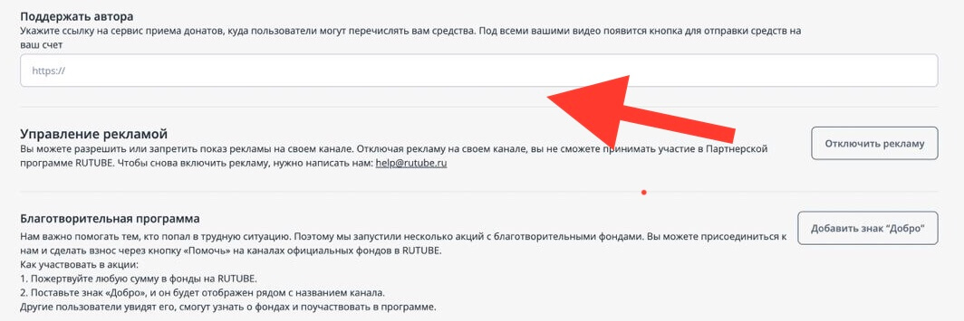 Когда вы создали себе ссылку, заходите обратно на Rutube: нажимаете на аватар — «Мой канал» — «Настроить вид канала» — прокручиваете страницу до блока «Поддержать автора» и вставляете ссылку.