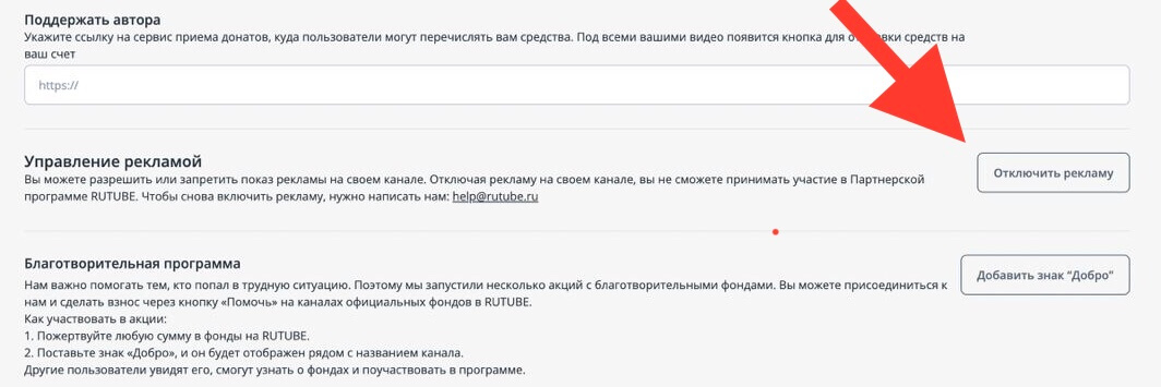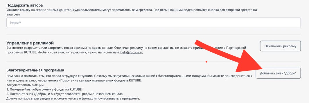 Эта программа помогает желающим перевести любую сумму в благотворительный фонд. Если вы воспользуетесь этой функцией, то Rutube добавит знак «Добро» рядом с названием вашего канала.