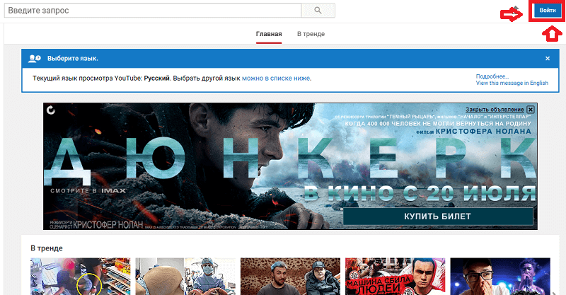 1. Чтобы зарегистрироваться на Ютубе, необходимо зайти на сайт YouTube.com и в правом верхнем углу кликаем на кнопку «Войти».