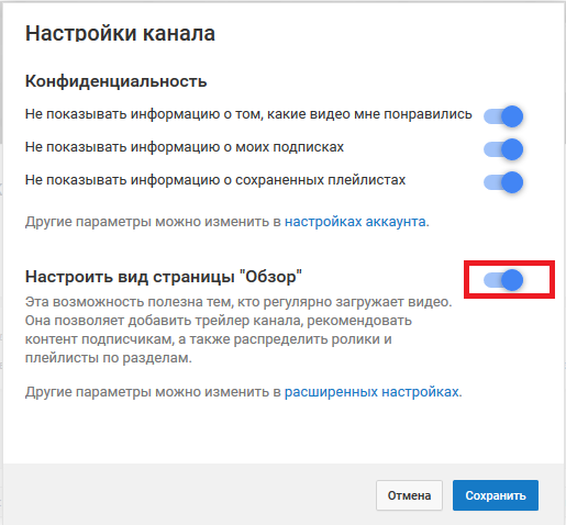 Здесь главное включить вид страницы «Обзор». Благодаря этому на Вашем канале появятся вкладки: главная, видео, плейлисты, каналы и о канале.