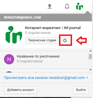 Для того, чтобы создать второй канал на Ютубе, не обязательно регистрировать новый аккаунт в Google, можно сделать его на уже созданном. Для этого там же, в правом верхнем углу кликаем на иконку своего канала, а затем нажимаем на шестерёнку.
