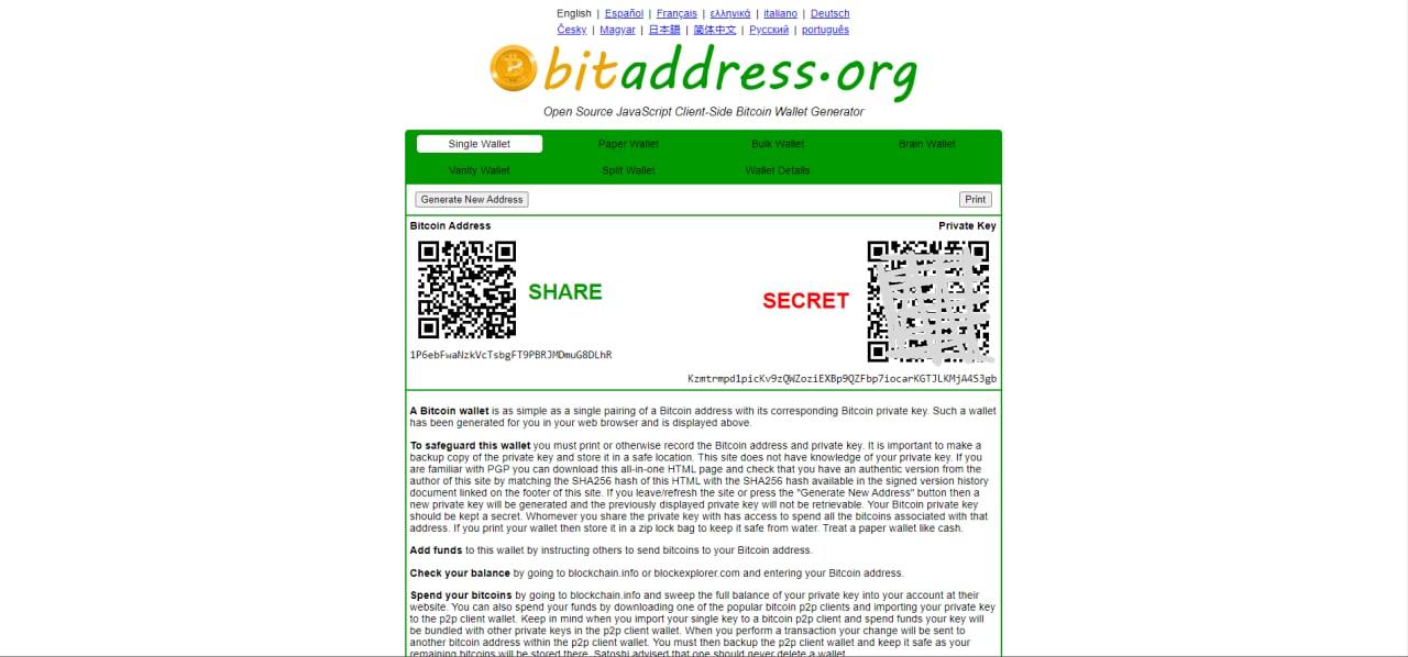 2. Бумажный кошелек готов. У Вас на экране два кода: публичный и приватный. Нажимаете на кнопку Print.