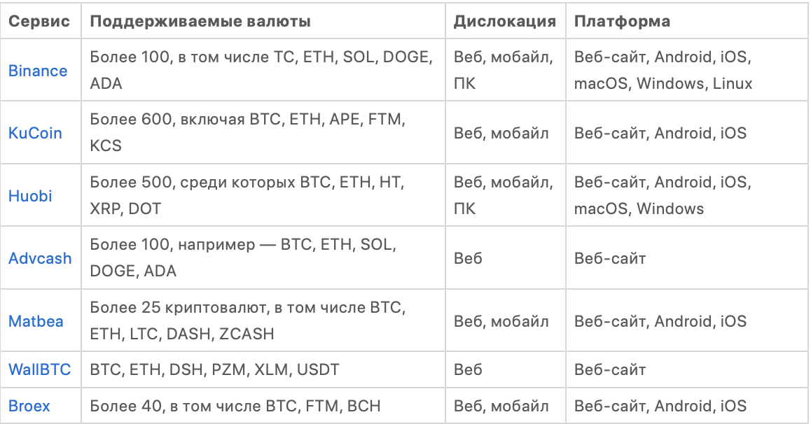 Такие кошельки часто создается на базе бирж (Binance, KuCoin, Huobi) и дают доступ к финансовым продуктам биржи (торги, стейкинг, торговля на фьючерсах). Мультивалютные хранилища также предоставляют обменники криптовалют, P2P-площадки (например, BestChange, Matbea, LocalCryptos) и лицензированные веб-сервисы (Broex, Advcash, WallBTC).