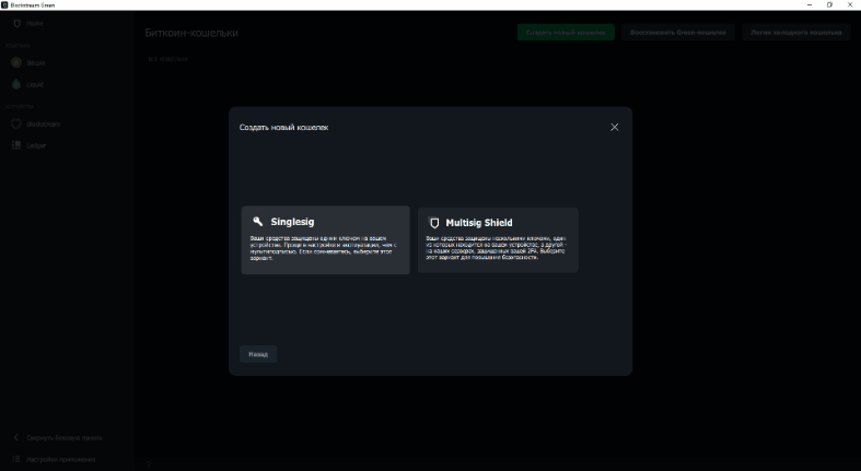 2. Выберите валюту для будущего кошелька — Bitcoin или Liquid. Создайте кошелек, следуя указаниям программы-установщика.