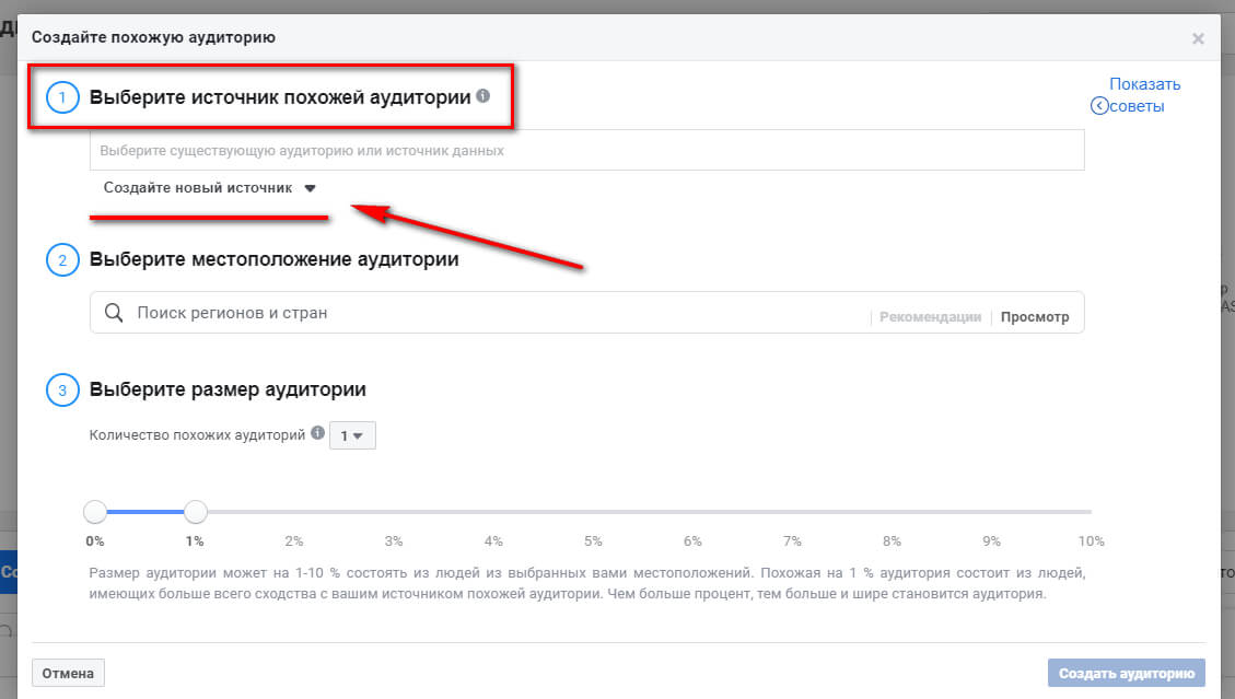 Пока остановимся на просто пользовательской аудитории. Алгоритмам нужно от чего-то отталкиваться, чтобы сформировать похожую аудиторию. Выбирайте исходную базу, где есть от 1 000 пользователей (достаточно до 50 000).