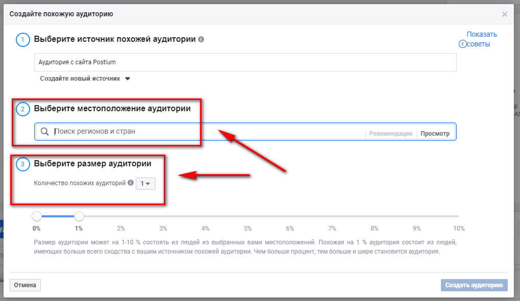 Шаг 8. После выбора источника выбираем местоположение и размер аудитории.
