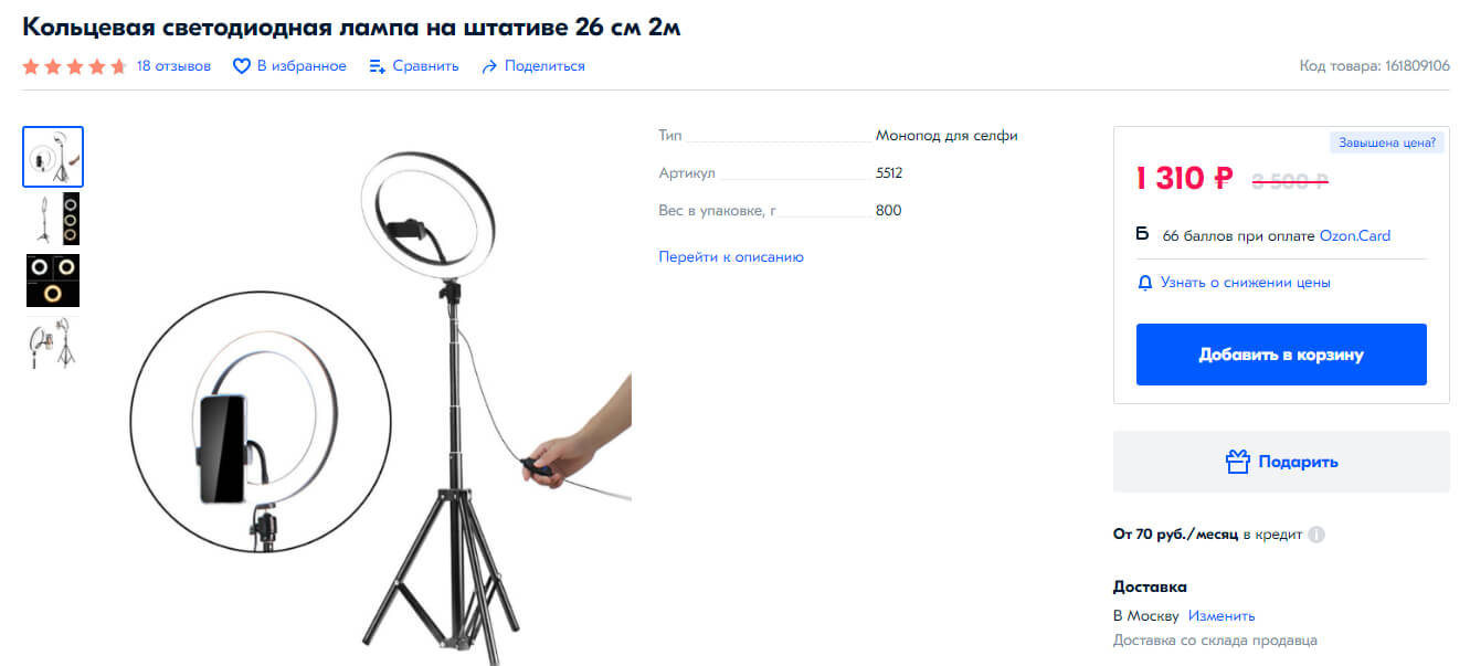 Освещение. Самый бюджетный вариант — это селфи-кольцо Led. Кстати, сейчас продаются кольца со встроенным держателем для телефона, так что можно сэкономить на штативе. Цена кольцевой лампы — до 2 000 рублей.