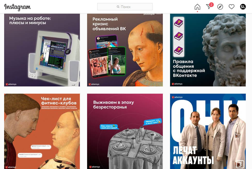 Подсмотреть примеры брендированного оформления можно у коммерческих аккаунтов, пример — @advensys.ru.