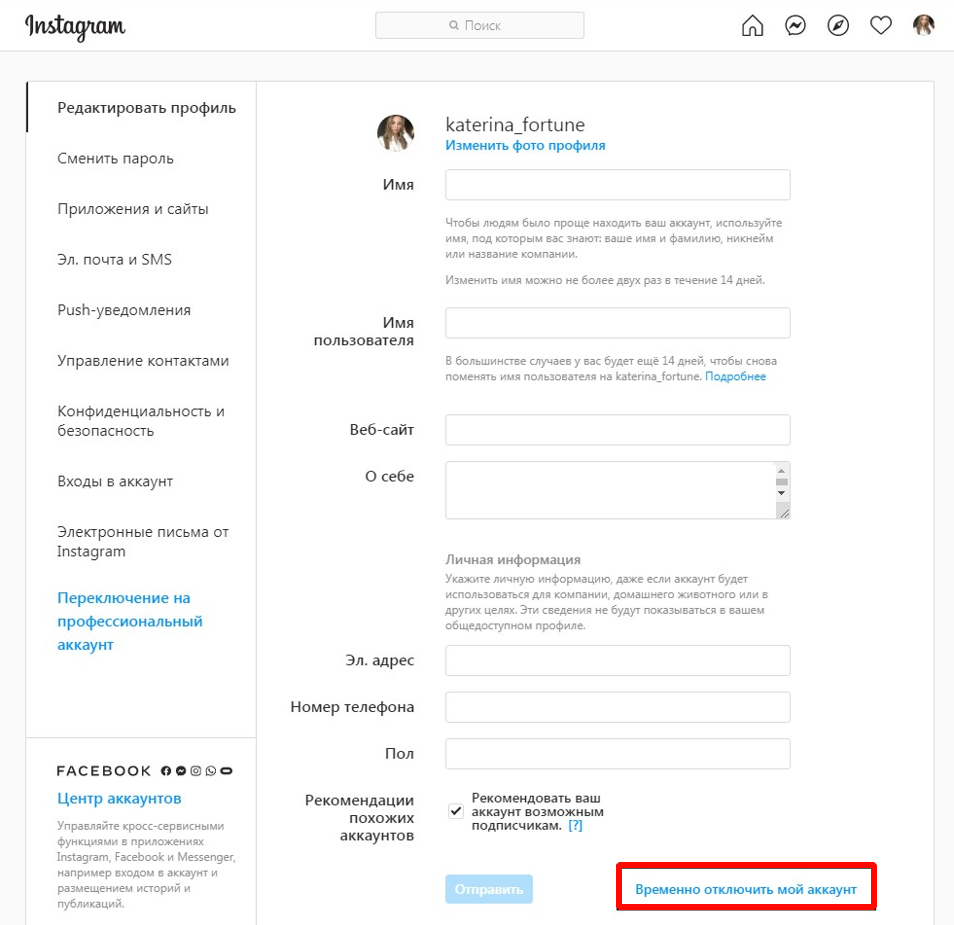 Если просто хотите на время отдохнуть от Instagram и не поддаться искушению зайти туда, то можно временно отключить свой аккаунт в Instagram. Сделать это можно только с веб-версии сайта, через мобильное приложение не получится.