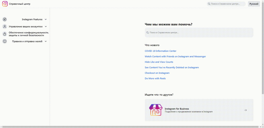 Перейдите в настройки, далее в раздел “Настройки - Справочный центр”. Если нужно, интерфейс можно переключить на русский язык (внизу страницы). Кликните по кнопке “Управление вашим аккаунтом”, а затем “Удаление аккаунта”.